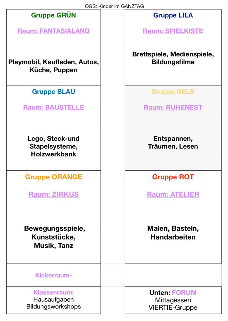 Die Kinder gehören zu einer Farb-Gruppe mit festen Bezugspersonen und werden in diesem Rahmen die Gruppenregeln erarbeiten, gewünschte Aktionen planen und auch Feiern wie Geburtstage u.a. durchführen. Darüber hinaus dürfen sie sich frei ihre Tagesaktivität in einem Themenraum auswählen und auch nach Bedarf wechseln.