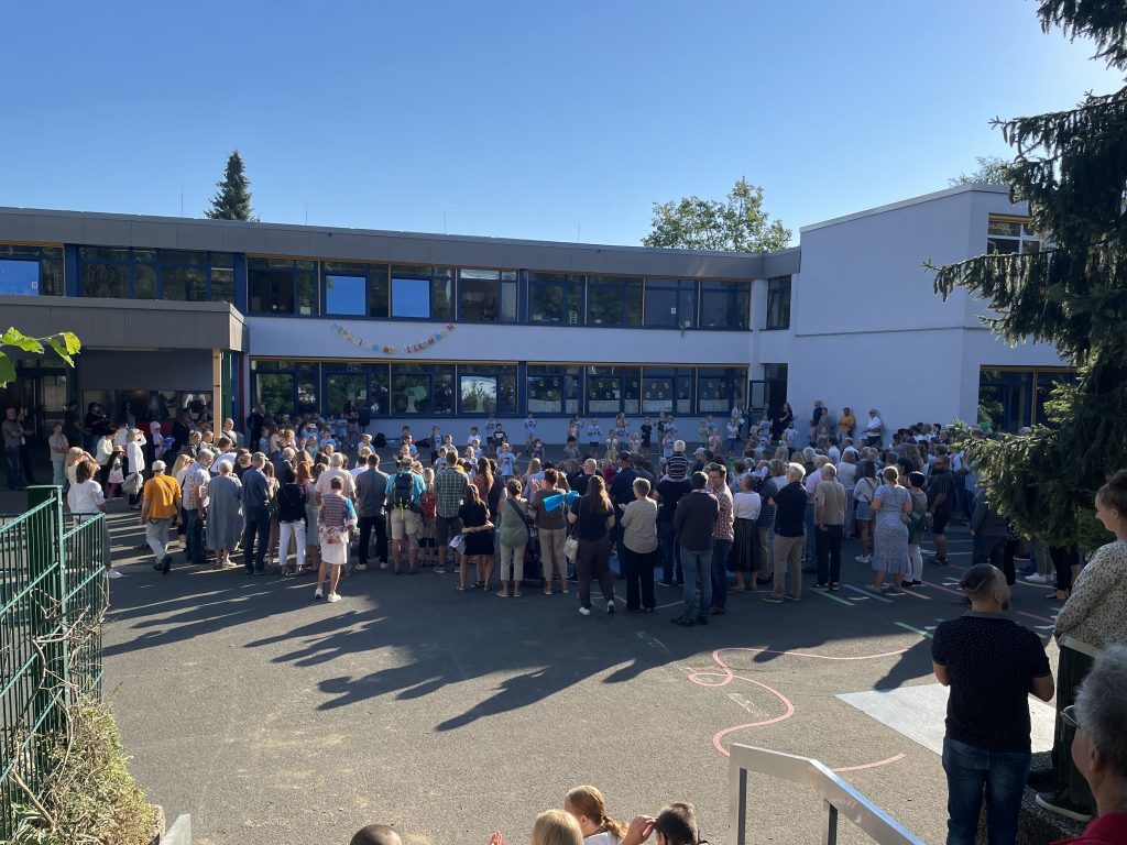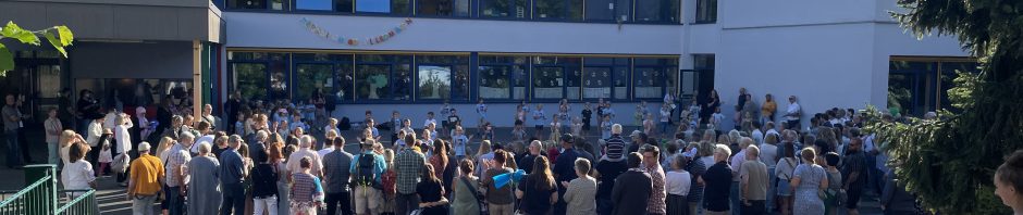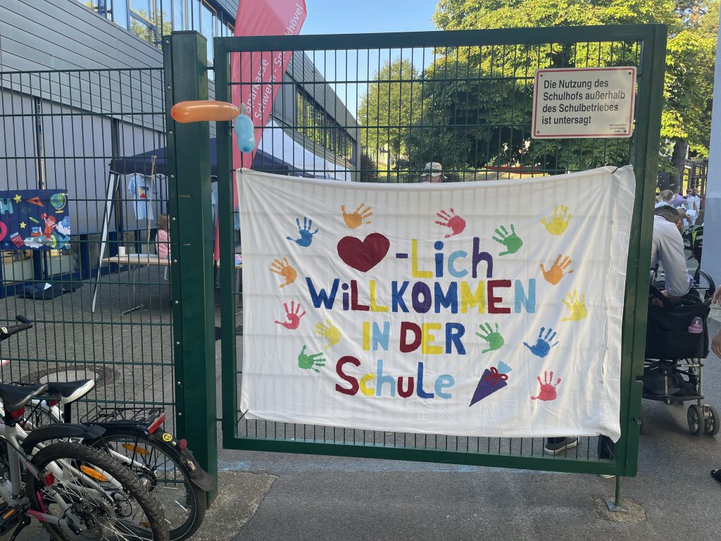 Bei bestem Sommerwetter durften wir am letzten Donnerstag unsere neuen Erstklässler auf dem Schulhof begrüßen. Pünktlich um acht Uhr waren alle Vorbereitungen abgeschlossen. Ein großes Plakat hieß alle Besucher “Herzlich Willkommen”. Der Einladung auf den Schulhof waren neben den Kindern auch viele Angehörige und Freunde gefolgt.