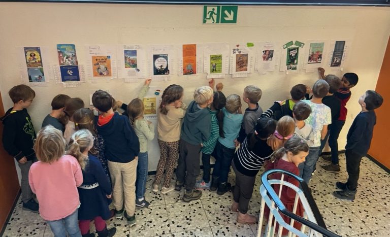 Bereits in der ersten Stunde durften die Kinder nach und nach ins Treppenhaus gehen, wo sie von einer Vielzahl an bunten Buchplakaten empfangen wurden. Jedes Plakat stand für ein bestimmtes Buch, darunter viele beliebte Titel wie Petronella Apfelmus, die Nordseedetektive, Drache Kokosnuss und Räuber Hotzenplotz. Jedes Kind durfte sich für ein Buch entscheiden und eine Eintrittskarte vom den entsprechenden Plakat abziehen.