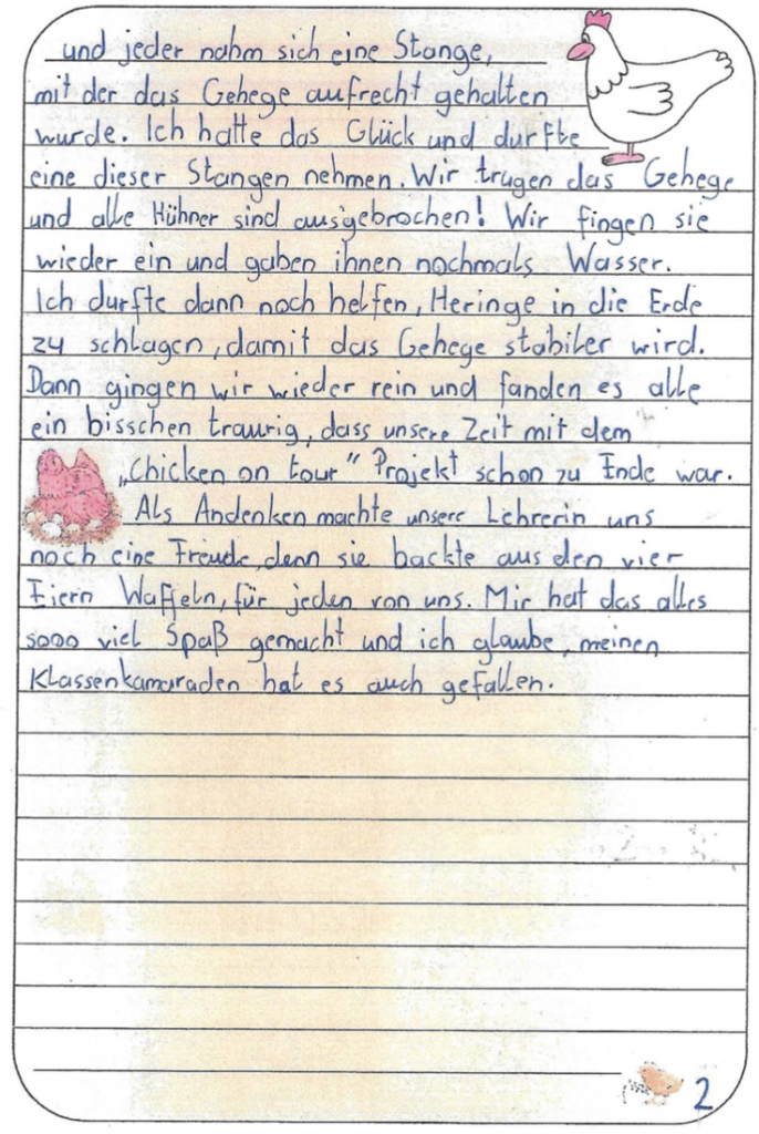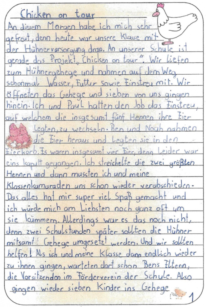 Mit dieser Frage startet für den jeweils aktuellen “Hühnerdienst” häufig der Schultag. Aufgeregt geht es dann Richtung oberem Schulhof, denn seit mittlerweile mehr als zwei Wochen sind dort unsere 5 Hühner in ihrem Gehege zuhause. Und in dieser Zeit ist schon einiges passiert. So musste das Gehege versetzt werden, nachdem sich ein Huhn im Schatten der Bäume einen Schnupfen eingefangen hatte. Durch kleine Löcher im Zaun gelang auch einzelnen Hühner zwischenzeitlich die Flucht. Zum Glück fühlen sich die Tiere aber sichtlich wohl und ließen sich problemlos wieder einfangen. Der “Hühnerdienst” ist bei den Klassen durchaus beliebt. Aber was heißt das eigentlich genau? Welche Aufgaben verstecken sich dahinter? Die Klasse 4b hatte ihren Dienst an einem ganz besonders aufregenden Tag. Also haben wir die 4b gefragt und Zoe war so nett uns ausführlich zu antworten. Vielen Dank liebe Zoe.